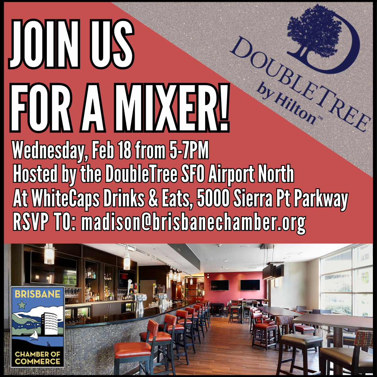Join us for our February mixer on Wednesday, February 18, from 5 pm-7 pm, hosted by the DoubleTree SFO Airport North Bayfront at WhiteCaps Drinks + Eats (5000 Sierra Point Parkway). Attending a mixer is an excellent way to network with other business professionals and community leaders.